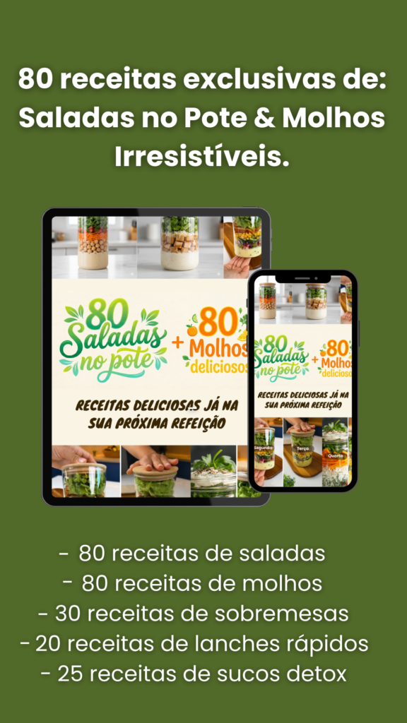 80 receitas de Saladas e Molhos deliciosos e simples de fazer, eles abastecem a sua geladeira e duram por até 7 dias sem muchar ou azedar.